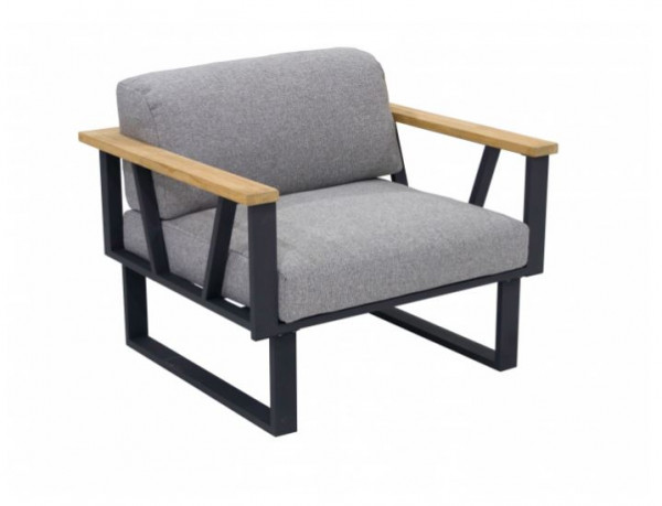 Der Rahmen des Stuhls ist graphitfarben und besteht aus Edelstahl, der pulverbeschichtet ist. Das Polster ist in der Farbe tweed grey gehalten und sehr bequem. Mit den Armlehnen aus Teakholz sind sie zusätzlich durch einen natürlich aussehenden Hocker unterstützt.
